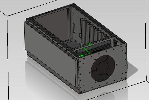 The air enters the end opposite the fan, on both sides of the 'front panel'. The air goes through the heatsink fins on both sides and eventually enters the chamber that houses the fan. There is NO airflow inside the enclosure, which is sealed. I did not find an easy way to tell FloWorks to not consider the fact that there is no airflow inside the box. Still, I think It should be able to figure that out.