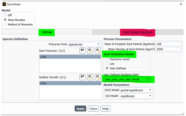 Thank you for your reply. An Ansys Employee replied to my question and I found that the UDF is actually only allowed for Pdf based combustion models. Here, I am using the species model to simulate the ethylene laminar diffusion flame! They mentioned that "this limitation is being removed for V 24.2 and it will be usable with species model as well in the future" Thank you so much for your suggestion about implementing the Moss-Brookes model completely via UDS and UDF. Your code was really helpful and helped me understand how to do that. You saved me! I appreciate that. Arash |