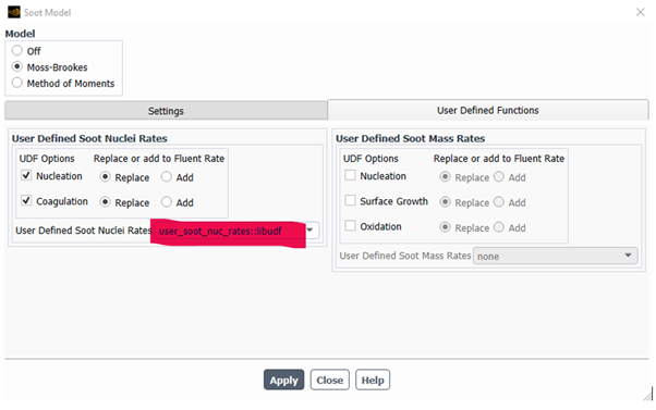 Hi, I want to use Fluent to simulate the effect of ethylene dilution by N2 on carbon fume, but the Moss-Brooks model is based on methane study, and parameter correction is needed, what operation is needed to modify the carbon black nucleation rate constant in the Moss-Brooks carbon fume model? Is it programmed with UDF itself to set it? I hope you can give me an answer, thank you!