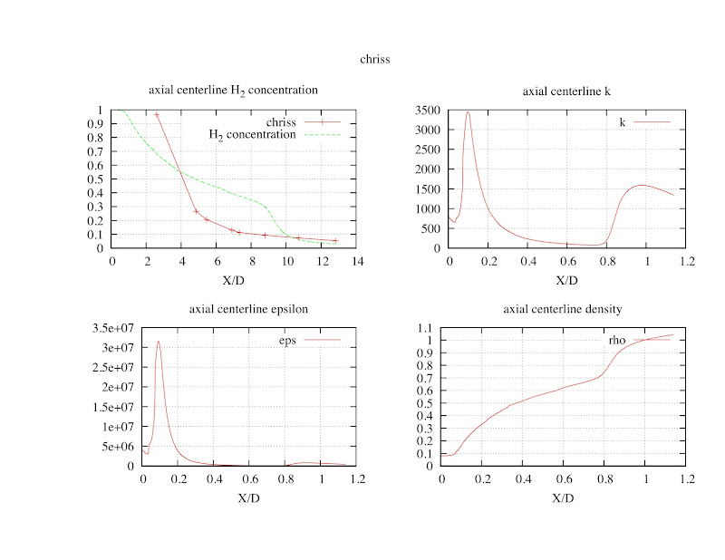 In our simulation, concentrically aligned free-jets are simulated for comparison with experimental data. In this figure, turbulent viscosity measured on the domain's centerline is shown in red, the axial velocity measured on the domain's centerline is shown in green, and the experimental axial velocity data which we seek to match is shown in orange. These curves are overlaid on top of the domain which is shown in blue. ![]() Why would k-epsilon produce the large amount of turbulent viscosity starting at about 40% of the length of the domain? Grid dependency in the direction of flow has been eliminated. Further simulation details: